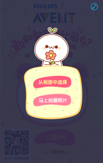 抓住品牌目标用户妈妈群体爱晒娃的特点,上传自己宝贝PK萌值,真人头像,配合卡通的背景,还有像时下很火的IN拼图软件一样,选道具增加萌值,非常很讨喜